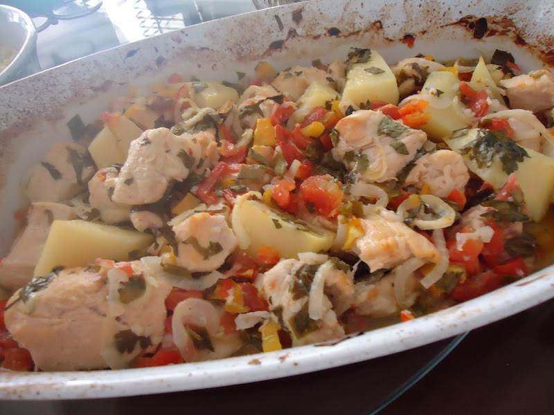 - Misture os pimentões, as cebolas, os alhos e os tomates. Junte-os ao frango Junte também as batatas e adicione todos os temperos restantes.