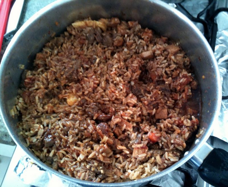 - Em seguida coloquei o arroz e mexi para que ele se integrasse totalmente com as carnes.