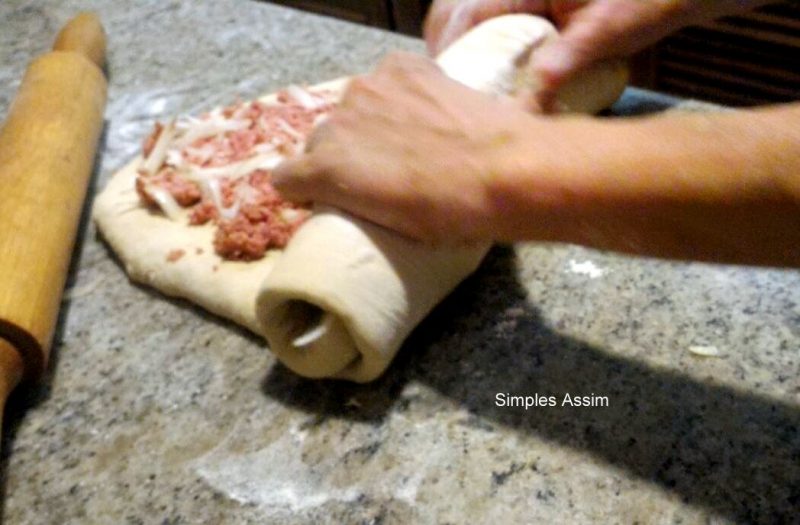 - Depois deste crescimento, abaixe a massa na bancada enfarinhada, abra num retângulo, espalhe o recheio e enrole como um rocambole.