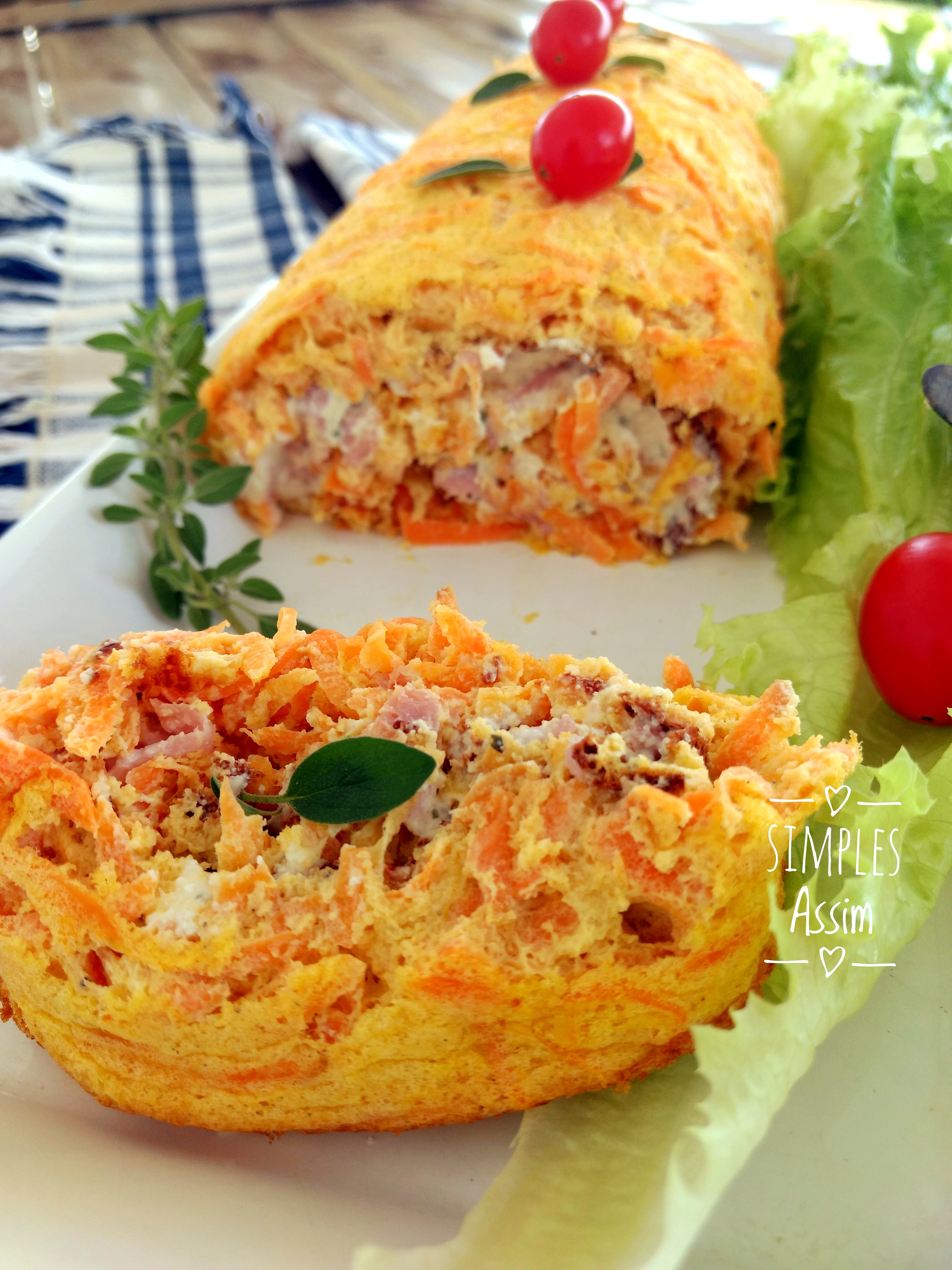 E , para os intolerantes ao glúten, ainda tem a vantagem de não ter esse ingredientes. Ele é leve, a massa é feita com cenoura, iogurte, ovos e queijo ralado. O recheio leva ricota e presunto. Mas você pode variar.
